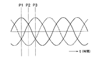 コイル13に三相交流電流を流すと、図9に示すように、第1の巻線131a(U相コイル13U)と第2の巻線131b(W相コイル13W)及び第3の巻線131c(V相コイル13V)は、それぞれ120度位相がずれた正弦波形を描くこととなる。例えば、図5において時間tとともに経過する3位置を選択し、それぞれの位置を時点P1、P2、P3とすると、時点P1、P2、P3における合成磁界は、図10に示すように表される。つまり、それぞれの時点P1、P2、P3における最大磁力がずれることとなるから、これが時間とともに移動する移動磁界となって鉄粉搬送装置10の搬送面151に載った鉄粉は搬送されることとなる。