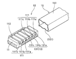 鉄芯11のコア部112は、図5〜6に示すように、胴部113と頭部114とが分離して形成されている。胴部113には、上部に水平溝113aがコア部112の幅方向の両面に沿って形成され、頭部114は、胴部113の水平溝113aに係合可能に形成されている。胴部113における水平溝113aの上部113b両面は、図例において、上方に広がる傾斜面113cを有している。この上部は、傾斜面でなく垂直面であってもよい。