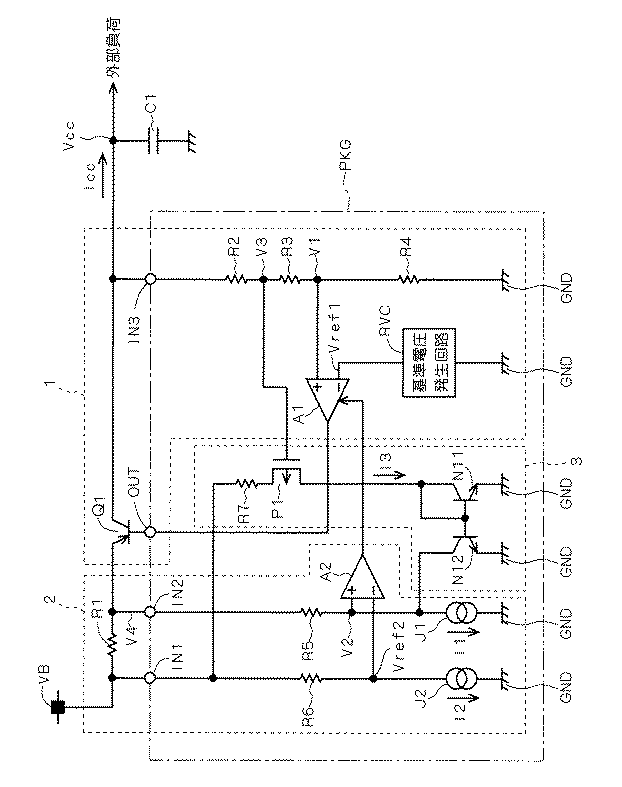 上述の実施の形態1に係る安定化電源回路では、PMOSトランジスタP1のソースには抵抗素子R7を介して入力電圧VBが印加されている。したがって、入力電圧VBを大きくすると、PMOSトランジスタP1ではソース電圧とゲート電圧との電圧差が大きくなるため、入力電圧VBの供給時にPMOSトランジスタP1がオン状態となり、当該PMOSトランジスタP1に電流I3が流れることがある。その結果、電圧V2が基準電圧Vref2よりも低下して、上記の電流制御ループIR2の働きにより、出力電流Iccが低減して、出力電圧Vccが本来の一定電圧まで上昇しないことがある。そのために、外部負荷に十分な電力を供給できない問題が生じることがある。