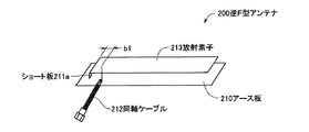 また、図11に示す逆F型アンテナ200において利得が最も広帯域になるよう最適化した逆F型アンテナ201の構成を図13に示す。図13に示す逆F型アンテナ201では、同軸ケーブル212により給電される放射素子213におけるショート板211aからの距離b2が約60mmとされて利得が最も広帯域になるよう最適化されている構成を除いて、逆F型アンテナ200と同様の構成とされている。この図13に示す逆F型アンテナ201におけるZ軸方向の利得の周波数特性を図10に「従来例2」として示している。図12に示す「従来例2」の周波数特性を参照すると、最大利得は約−3.5dBしか得られておらず、利得の周波数特性はブロードとなっているが−5dB以上とされる比帯域でもわずか約8%しか得られていない。このように、従来の逆F型アンテナにおいては、利得が広帯域になるよう最適化した場合は利得が小さくなり、利得の周波数帯域も本発明にかかるアンテナ装置1の利得の周波数特性にははるかに及ばないことがわかる。