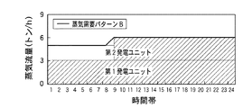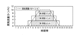 次に、本発明に係る小型貫流ボイラ発電システムの運転制御方法の実施例について、図3〜図5を用いて以下説明する。図3は本発明の実施例に係る蒸気利用プロセスの蒸気需要パターン例を示す説明図、図4は図3に示す蒸気需要パターンAに対する小型貫流ボイラ発電システムの運転ユニット数の決定方法を説明するための説明図、図5は図3に示す蒸気需要パターンBに対する小型貫流ボイラ発電システムの運転ユニット数の決定方法を説明するための説明図である。