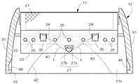 外刃ホルダー(12)の前側内面壁(31a)と、前側内面壁(31a)に対向する取付基部(26)とのいずれか一方に、支点突起(40)が設けてある請求項1記載の電気かみそり。 - 装着ベース(22)の内面側に補強板(23)が固定されて、補強板(23)の下縁寄りに操作部(27)が形成されており、