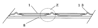 特許文献3には、焼成時の加熱により、焼結していない電極材料が搬送用ベルト8の金属と合金化するのを防ぐために、半導体基板1の対向する二辺を支持して、半導体基板1と、搬送用ベルト8との間に空間領域を形成することが記載されている。図4はこのときの半導体基板と、搬送用ベルトの位置関係を示しており、図4において半導体基板は、搬送用ベルト8の進行方向に直角な向きの断面を示す。また、図5は図4のZ部の拡大図を示している。図5に示されるように半導体基板1は搬送用ベルト8の上に設けられた支持部材13の略凸型の突出部の段部で保持される。ゆえに、図4に示されるように半導体基板1の対向する二辺を支持して、半導体基板1と搬送用ベルト8との間に空間領域を形成することによって、半導体基板1と搬送用ベルト8との接触面積が小さくなる。したがって、半導体基板1の全面が搬送用ベルト8と触れるということがないため、焼成時の加熱によって電極材料が搬送用ベルト8に貼りつくことなく焼成が行われる。