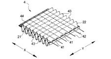 複合伸縮部4の伸縮方向(X方向)の列とそれに隣接する列との間には、接合部41の存在しない領域が、複合伸縮部4の両端部44間に亘って連続的に形成されており、その領域に弾性部材42が非接合状態で配されている。その結果、複合伸縮部4の伸縮方向(X方向)において相隣接する接合部41,41間に、それぞれ2本の襞43が形成される。