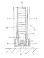 図1に示した戸尻側の竪枠部材12には、戸先側(閉じ側)へ水平方向に延出した2個のストップ部材59が、図示されていないが、第1扉体21の厚さ方向に離間して取り付けられており、2個のストップ部材59のうちの一方が、第1扉体21の第1垂下部21Bに当接可能な位置に配置されており、他方が、第1扉体21の第2垂下部21Cに当接可能な位置に配置されている。開き側へ移動した第1扉体21の第1垂下部21Bが、前記2個のストップ部材59のうちの一方に当接すると同時に、第2垂下部21Cが他方に当接することにより、第1扉体21は前記出入口2を全開又は略全開とする図3の位置(開き限位置)に達する。なお、ストップ部材59は1個でもよい。この場合には、ストップ部材59は、第1扉体21の第1垂下部21B又は第2垂下部21Cのいずれか一方に当接可能なものであればよい。