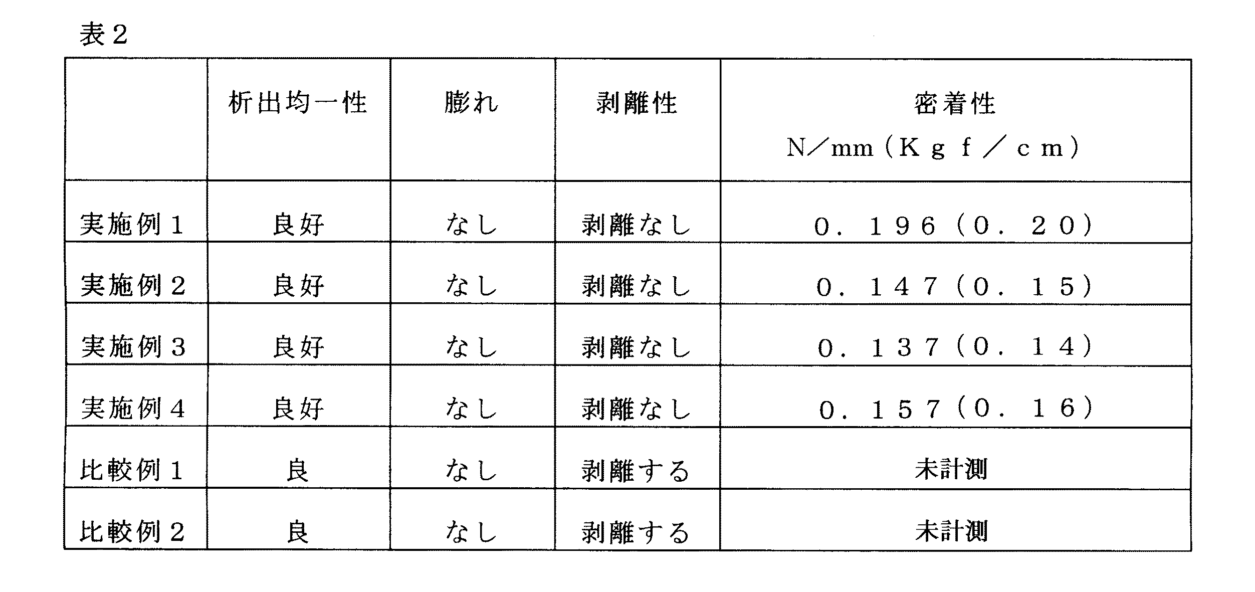 実施例1で得られた被めっき材を、さらに加熱乾燥後、その表面を酸洗浄し、次いで、電解硫酸銅めっき処理をした。用いた電解銅めっき液は公知のELECTROPOSIT(商標)1100電解銅めっき(ローム・アンド・ハース電子材料製)であった。得られた銅めっき皮膜は膜厚が18μmであり、その皮膜に膨れは見られなかった。この銅めっき皮膜を1cm幅で切断し、プリント配線板試験方法JIS C5012に準拠し、角度90℃で引き上げ速さ50mm/minにより試験機によりその密着強度を測定した。その結果、密着強度は0.196N/mm(0.20kgf/cm)であった。