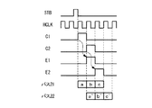 ロジック部88において、表示メモリ(RAM)回路83には、1フレーム分以下の階調データが格納される。表示メモリ回路83は、信号処理回路82から供給されるアドレス制御信号により、RAMの1行分のアドレスを1番目から最終番目であるn番目まで選択し、上記選択されたn個のアドレスから、パネル3の1表示ライン分のn個の階調データを一斉に読み出してラッチ回路B16に出力する。ラッチ回路B16は、そのn個の階調データを保持し、信号処理回路82からのラッチクロックであるラッチ信号(STB信号)に応じて、上記n個の階調データを一斉にデータ演算回路84に出力する。