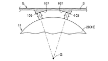 また、各弾性車輪105は、本体ケース5の上ケース3に形成された走行面107に接触している。これら走行面107は、各弾性車輪105が略垂直に接触するように、それぞれ側方へと下側に傾斜して形成されている。