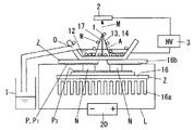 また図4に示す静電霧化装置Aの例では、ペルチェユニット16の放熱部16aと冷却部16bとを備えた水供給手段が設けてある。ペルチェユニット16は、熱伝導性の高いアルミナや窒化アルミニウム等からなる絶縁板Zの片面側に回路を形成してある一対のペルチェ回路板P(P1,P2)を、互いの回路側が向かい合うように対向させ、多数列設してある熱電素子Nを両ペルチェ回路板P(P1,P2)間で挟持すると共に隣接する熱電素子N同士を両側の回路で電気的に接続させ、ペルチェ入力リード線Lを介してペルチェユニット用電源20にてなされる熱電素子Nへの通電により一方のペルチェ回路板P1側から他方のペルチェ回路板P2側に向けて熱が移動するように設けたもので、前記一方のペルチェ回路板P1を冷却部16bに接続すると共にペルチェ回路板P2を放熱部16aに接続する。本例では図4に示すように、ペルチェ回路板P2を設けた絶縁板Zを放熱部16aとしての放熱フィンに接続すると共にペルチェ回路板P1を設けた絶縁板Zを後述する冷却部16bに接続するものである。