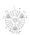 33は第1のスラスト受け16の収容穴16Cの底面16Eに設けられた径方向押し戻し手段としての渦巻溝である。この渦巻溝33は、略コ字状の凹陥溝として形成され、図10に示すように、筒状部材21の旋回方向の前側で大きな直径寸法となり、後側で小さな直径寸法となる渦巻構造に形成されている。