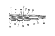 中継用FFC50は、FFC11と同様の構成としており、平行配線した銅箔からなる導体52の両面を絶縁フィルム53で被覆している。中継用FFC50の導体52は全て同一ピッチとしている。