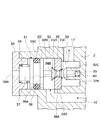 36は収容凹部32内に設けられた第1の弁体で、該第1の弁体36は、弁ポート35とばね受け34との間に軸方向に変位可能に挿嵌されている。また、第1の弁体36は、円柱状のピストン部36Aと、該ピストン部36Aから軸方向に突出し弁ポート35の第1の弁座35Bに離着座する弁部36Bとからなり、前記ピストン部36Aの外周側には、内周面32Bとの間を気密に保持するためのシール部材36Cが装着されている。また、第1の弁体36のピストン部36Aは、ばね受け34との間に連通路33と隔絶されたばね室37を形成し、該ばね室37は、ばね受け34の大気通路34Aを介して大気に開放されている。