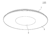また、本実施の形態においては、シャーシ1の中央部に設けた電源部6を覆う電源カバーとしてのセンタカバー9の周縁部を、環状の透光部91としている。なお、センタカバー9の透光部91は、天板反射シート5よりも外径が大きくなるようにしてある。LEDモジュール2からの光の一部は、図9に示すように、センタカバー9の周縁部である透光部91に入射角が大の状態にて入射し、該透光部91において乱反射、即ち多方向に反射する。透光部91において乱反射した光の一部は、リングカバー8において更に反射して、照明装置100の外部に出射する。このように、LEDモジュール2からの光の一部がセンタカバー9の周縁部において多方向に向けて出射するから、センタカバー9とリングカバー8の境界部分を目立たなくすることができる。
