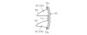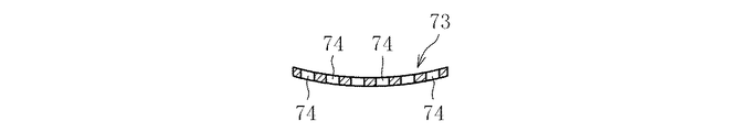 63がボルト部材67を介してこの円弧状保持用プレート65に固着される。なお、円弧状保持用プレート65は、図9と図10に示すように、基板部70と、この基板部70の内面(固定刃47が突出する側の面)の両短辺側に配置される短辺枠71a、71bと、基板部70の内面の両長辺側に配置される長辺枠72a、72bとからなる。そして、一方の長辺枠72a側に1個の固定刃47bが配置され、他方の長辺枠72b側に2個の固定刃47bが配置されている。