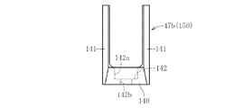 図16は円弧状保持用プレート65に付設される固定刃47b(150)の変形例である。この固定刃47bは、図17と図18に示すように、矩形状の基部140と、この基部140の両端部(長辺側端部)から立設される一対の比較的肉厚の立ち上がり壁141、141とを備える。基部140にはボルト孔142が形成されている。このボルト孔142は、大径部142aと、この大径部142aに連通される貫通孔142bとからなる。そして、このボルト孔142にボルト部材(図示省略)が挿入されてプレート65に螺着される。