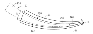 また、プレート嵌合溝165は、図22に示すように、外径側受面部166と、内径側受面部167とを有し、外径側受面部166と内径側受面部167との間の間隔(嵌合溝の上下幅寸法)が円弧方向に沿って変化するテーパ状とされている。このため、ケーシング本体31の開口部(側方開口部)40を介して排出用プレート73は粉砕室26に出し入れ可能となっている。なお、排出用プレート73が粉砕室26に装着された状態(ガイド部157が嵌合溝165に嵌合した状態)では、本体部156は、ハンマー部材29の先端縁の円軌跡に沿った(対向)した曲率半径となる円弧形状となっている。