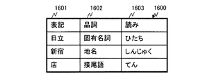 図21に示す解析結果1600は、図9に示す単語辞書800と同じ列を含む。解析結果1600は、表記1601、品詞1602、および読み1603を含む。本実施形態のサーバ側装置101は、図21に示すように、地点「日立新宿店」の文字列を、「日立」、「新宿」、および「店」の形態素に分割する。