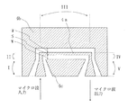 図21に第2の従来技術に使用するCPW進行波電極4の上面図を示す。第2の従来技術においても第1の従来技術と同様に、Iは入力用フィードスルー部、IIは入力側接続部、IIIは相互作用部、IVは出力側接続部、及びVは出力用フィードスルー部である。出力用フィードスルー部Vは不図示のコネクタ芯線(あるいは金リボンや金ワイヤー)もしくは終端抵抗に接続されるのも同じである。これらの第1の従来技術と同じ構成に加えて、図21に示す第2の従来技術には長さL6のインピーダンス変換部VIが付加されている。