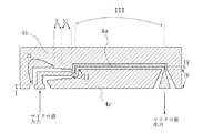 なお、入力用フィードスルー部Iの中心導体において高周波電気信号を給電する部位を給電部とし、また、出力用フィードスルーの中心導体において高周波電気信号を取り出す部位を出力部と呼ぶ。 A portion that feeds a high-frequency electrical signal in the central conductor of the input feedthrough portion I is referred to as a feeding portion, and a portion that takes out the high-frequency electrical signal in the central conductor of the output feedthrough is referred to as an output portion.