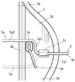 第二のプレート部3bの裏面には、図2,6に示すように誤組付防止用突部3mが形成されている。誤組付防止用突部3mは、位置決め部3kの下側位置に形成されており、位置決め部3kから斜め下方に延出している。したがって弾性架橋体5を第二のプレート部3bに組付ける際に、屈曲部5aが第三のプレート部3cに向いた状態になることを誤組付防止用突部3mによって防止できる。かくして誤組付防止用突部3mによって弾性架橋体5を正しく第二のプレート部3bに組付けることができる。
