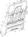 また本発明の他の特徴によると、胸椎回避部は、上下位置に開口孔を有しており、かつ開口孔の間に凹部を有している。したがって開口孔を有しているためにプレート体が軽量になる。そして開口孔と凹部を有しているために胸椎への押圧力が十分に小さくなる。また上下の開口孔の間に凹部を有しているために、凹部によってプレート体の大きな変形を防止することができる。特にプレート体の開口孔が大きく変形することを防止することができる。例えば、シートバックを後方に大きく倒した状態で、開口孔の上方に乗員が膝をつく行動をしたとしても、プレート体によるパッドの支持強度が不足する事態を防ぐことができる。したがって凹部によってプレート体の強度が強くなる。 According to another feature of the present invention, the thoracic vertebra avoiding portion has an opening hole in the vertical position, and a recess between the opening holes. Therefore, the plate body becomes light because of the opening hole. And since it has an opening hole and a recessed part, the pressing force to a thoracic spine becomes small enough. Moreover, since it has a recessed part between the upper and lower opening holes, a large deformation | transformation of a plate body can be prevented by a recessed part. In particular, it is possible to prevent the opening hole of the plate body from being greatly deformed. For example, even when the occupant acts to kneel above the opening hole in a state where the seat back is greatly tilted rearward, it is possible to prevent a situation where the support strength of the pad by the plate body is insufficient. Therefore, the strength of the plate body is increased by the recess.