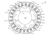 図2に示すように、ステータ12の内側には複数のティース19が周方向に一定間隔で形成されるようにスロット20が等間隔で設けられている。ティース19及びスロット20は、ステータ12を軸方向から見た場合に回転シャフト15を中心とした回転対称となるように配置されている。この実施形態ではティース19及びスロット20がそれぞれ18個設けられている。したがって、ロータコア16の磁気的突極18の数をPn、ステータ12のスロット20の数をPsとした場合、Pn=8、Ps=18となり、Pn及びPsが1以外の公約数を有し、かつPn:Psが4:9を満足する。
