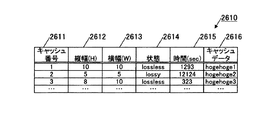 縦幅2612は、キャッシュ番号2611のキャッシュデータの縦幅を示すデータである。横幅2613は、キャッシュ番号2611のキャッシュデータの横幅を示すデータである。縦幅2612及び横幅2613の単位は、ドット等である。状態2614は、キャッシュ番号2611のキャッシュデータがJPEG方式により圧縮されているか否かの状態を示す情報である。状態2614では、JPEG方式により圧縮されていない状態を “lossless”と表し、JPEG方式により圧縮されている状態を “lossy”と表すものとする。