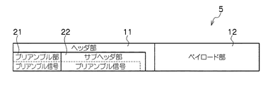 サブヘッダ部22についてプリアンブル信号で構成する場合には、当該サブヘッダ部22のプリアンブル信号は、プリアンブル部21におけるプリアンブル信号に対して付加的なものとして構成される。かかる場合において、このサブヘッダ部22のプリアンブル信号は、その直前のプリアンブル部21のプリアンブル信号の延長のビット列で構成するようにしてもよい。かかる場合には、データパケット5を受信する側の通信装置2において、このサブヘッダ部22のプリアンブル信号と、その直前のプリアンブル部21のプリアンブル信号とを一体化して受信処理を行うことが可能となり、実質的にプリアンブル系列のビット列の拡張となることから、同期性能をより向上させることが可能となる。