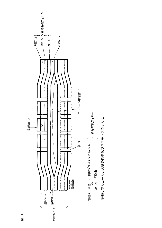 包材Bに使用する無孔フィルムとしては、アルコールガス透過性の材料であれば特に限定されないが、例えばエチレンまたは酢酸ビニルの重合体フィルム、エチレン−酢酸ビニル共重合体フィルムが挙げられる。その中でも、強度やヒートシール性に優れ、コストバランスの点においても有利であることから、エチレン−酢酸ビニル共重合体フィルム(EVA)5が好ましく使用される。 The non-porous film used for the packaging material B is not particularly limited as long as it is an alcohol gas permeable material. Examples thereof include ethylene or vinyl acetate polymer films and ethylene-vinyl acetate copolymer films. Among them, ethylene-vinyl acetate copolymer film (EVA) 5 is preferably used because it is excellent in strength and heat sealability and advantageous in terms of cost balance.