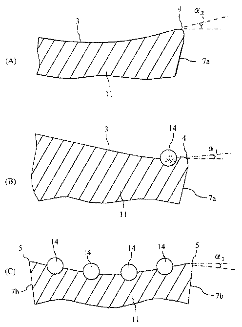なお、本発明における突起の構成としては、上記図3の構成に限定されるものではなく、図4に示すように、基体11の表面にAl2O3粒子の一部が埋め込まれて一部が突出した構成の突起14であってもよい。この場合には、突起14が基体11とは別体の球状体にて形成されているので、突起14が切削中に脱落してしまっても、脱落した跡が孔になって油孔の役目を果たすので切屑のベタ当たりを抑制することができるとともに切屑の流れが円滑になって先端切刃4の温度上昇を抑制できる点で望ましい。