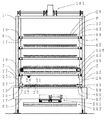 棚フレーム1は、前面に各パレットを出し入れするための開口を有する。そして、棚フレーム1の内側には、複数の素材パレット12を収納するために、上下方向に複数段の収納棚5が左右対称に設けられている。その収納棚5に素材パレット12を収納する。また、収納棚5の下方には、第1製品パレット15を収納するために収納棚7が左右対称に設けられている。その収納棚7に第1製品パレット15を収納する。