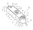 図2に示すように、点灯装置部12は、箱形状に形成されたケース23内に不図示の安定器や不図示の電源端子台等を収容しており、ケース23の一端部側にブラケット13の上端部を回転自在に支持するとともにプラグ部15を覆うための筒部24を有する。プラグ部15は、プラグ操作レバー25を有し、このプラグ操作レバー25の上方側に、ライティングダクト1の開口部2に挿入される幅寸法を有するI字形状に形成された回転プラグ板20と、この回転プラグ板20の上方側に配置された第1回転端子21および第2回転端子22とが支持ピン26を介して一体に結合されている。プラグ操作レバー25は筒部24に形成された回動角度規制用の切欠27により、その回動角度が90度に設定されている。