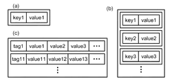 図4の(a)は系列データのデータ形式の一例を示す図であり、図4の(b)はスナップショットのデータ形式の一例を示す図である。また、図4の(c)は金融情報ファイルのデータ形式の一例を示す図である。一例として、系列データは、キー(key)とバリュー(value)との2つのパラメータを含むデータセットであり、スナップショットは、キー(key)とバリュー(value)との2つのパラメータを含むデータセットの集合である。キーは、金融情報の種類(株価であれば、現在値、始値、高値、安値、または売買高など)を示し、バリューは、キーにより示される金融情報の値を示す。例えば、キー=「現在値」かつバリュー=「1000」であった場合、このデータセットは、株価の現在値が1000円であることを示している。一方、金融情報ファイルは、一例として、ひとつのタグ(tag)に対して、予め定められた単位時間毎のバリュー、すなわち複数のバリューが対応付けられたデータセットの集合である。金融情報ファイルのタグはスナップショットのキーに対応するものである。すなわち、金融情報ファイルは、データ形式が異なるものの、その内容はスナップショットに含まれるデータの内容と同様である。この例で、ファイル読込部253は、ストレージ204に記憶された金融情報ファイル、すなわちデータセットの集合を一度に読み出し、データ処理部254へ引き渡す。