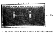ウシ、シカ、およびヒツジのミトコンドリアDNAについて、予め抽出DNAの濃度を測定した。次いで、PCRチューブあたり1.0ng、0.1ng、0.01ng、0.001ng(1.0pg)、0.0001ng(0.1pg)、および0.00001ng(0.01pg)のDNAを加えて、ペア1のプライマー対(5D2と3D5との組み合わせ)を用いてPCRを行った。電気泳動写真を図3に示す。その結果、0.1pgのDNAを含む場合でも、電気泳動のバンドはシグナル強度が強く、非常に高感度で検出可能であった。