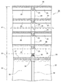 図7に、免震建物20に設けられた免震装置33の地震時における回転変形量を制御する回転制御機構の一つの実施例を示す。本免震建物用地震応答解析結果に基づき免震装置33に有害な回転を発生させないように、後述するように構造設計上の対策が検討される。特許文献2及び特許文献3には、その対策の一つの実施形態として、免震装置33の回転制御機構が提案されている。免震装置33の下部のパイルキャップ29及び基礎杭30には、接合鉄筋36が設けられ、上部アンカー35a及び下部アンカー35bにより定着され、つなぎスラブ27、パイルキャップ29及び基礎杭30が一体化されている。接合鉄筋36は、円形の基礎杭30の断面に合わせて複数の接合鉄筋36が円形に配置されている。この接合鉄筋は間隔(d)だけ離れている。また、接合鉄筋36には、パイルキャップ29と基礎杭30との境界を挟んでカップラー37が設けられる。また、パイルキャップ29と基礎杭30との境界には回転剛性調整シート38が設けられている。