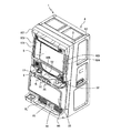 前面ドア2下部の正面には、左右に効果音や音声等の音による演出を行うスピーカ9L、9Rが設けられ、このスピーカ9L、9Rの間にメダルが払い出されるメダル払出口15が設けられている。前面ドア2最下部には、払い出されたメダルを貯留するメダル受け部16が設けられている。