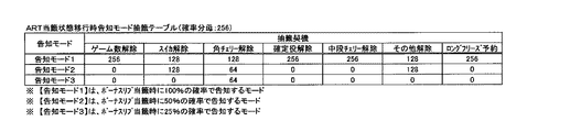 続いて、サブCPU81は、ART種別報知振分抽籤テーブル(図55参照)を参照し、現在の解除モードと演出用乱数値とに基づいて、報知振分を決定する(S457)。このように、サブCPU81は、入賞態様振分手段を構成する。