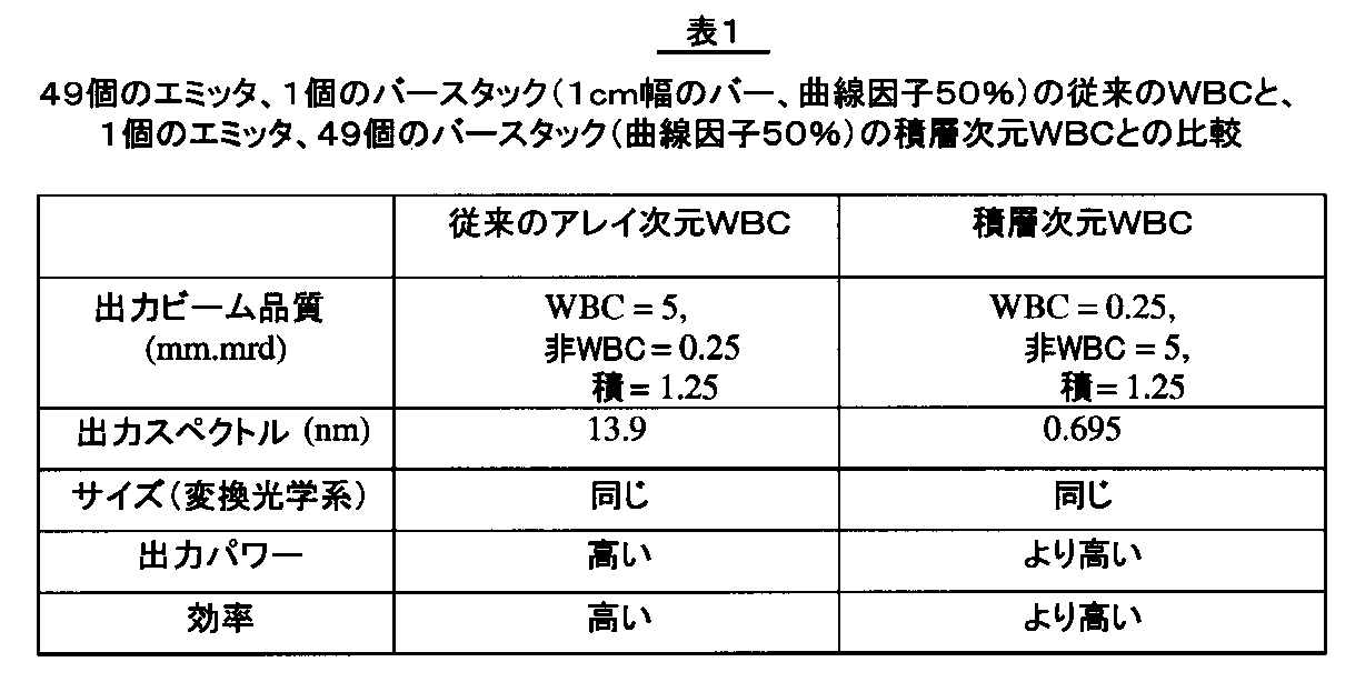 表1は、49個の広面積レーザ素子を備える単一の1cm幅のダイオードバーを用いた従来のアレイ次元WBCシステムと、各バーが1個のエミッタを備える49個のダイオードバーを用いた積層次元WBCシステムの例とを比較している。両方のシステムにおける曲線因子は50%である。計算は上記で与えられた式に基づく。出力スペクトルのスペクトル線幅Δλは式(1)を用いて計算される。従来のWBCの場合の次元x=10mmとし、積層次元に沿ったWBCの場合、x=10mm/20(ここで20はBPPの比率)とする。