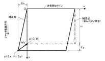 なお、図6に示した例では、シャッタ走査方向を下向きとしたが、これに限定されるものではなく、走査方向を右向きとする、すなわち左から右に向かって走査する構成に適用することもでき、この場合、座標系を適切な方向に設定すれば、前記と同じ要領で補正パラメータを算出することができる。 In the example shown in FIG. 6, the shutter scanning direction is downward. However, the present invention is not limited to this, and the present invention can be applied to a configuration in which the scanning direction is rightward, that is, scanning from left to right. In this case, if the coordinate system is set in an appropriate direction, the correction parameter can be calculated in the same manner as described above.
