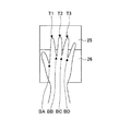 図3中、T1は、左から1番目の指(人差し指)の指紋中心座標を示す。T2は、左から2番目の指(中指)の指紋中心座標を示す。T3は、左から3番目の指(薬指)の指紋中心座標を示す。BAは左から1番目の指(人差し指)の左側の付け根の座標を示す。BBは、左から1番目の指(人差し指)の右側の付け根の座標であり、かつ、左から2番目の指(中指)の左側の付け根の座標を示す。BCは、左から2番目の指(中指)の右側の付け根の座標であり、かつ、左から3番目の指(薬指)の左側の付け根の座標を示す。BDは、左から3番目の指(薬指)の右側の付け根の座標を示す。