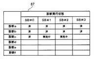 図5に、テーブル84に含まれる、SB42毎の診断状態実行テーブル87の一例を示す。診断状態実行テーブル87は、SB42の各々において実行される自己診断処理の実行状態を一時的に記録するためのテーブルである。図5では、診断状態実行テーブル87は、SB42の各々における自己診断処理の実行中を示す情報として「実施中」が表記され、自己診断処理の終了を示す情報として「済」が表記される一例が示されている。診断状態実行テーブル87における空欄は、該当するSB42の自己診断処理が未実施であることを示す。なお、自己診断処理の実行中を示す情報として予め定めたマーク(例えば、黒丸)、自己診断処理の終了を示す情報として予め定めたマーク(例えば、白丸)を登録してもよい。