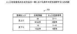 エッジ切替信号発生部20は、図14Aの表701に示すように、立上りの位相判定を行っている状態で位相情報が01になると、エッジ切替信号の値を「0」から「1」に変更する。また、エッジ切替信号発生部20は、立上りの位相判定を行っている状態で位相情報が01以外の場合、エッジ切替信号の値を「0」のまま保持する。さらに、エッジ切替信号発生部20は、立下りの位相判定を行っている状態で位相情報が10になると、エッジ切替信号の値を「1」から「0」に変更する。また、エッジ切替信号発生部20は、立下りの位相判定を行っている状態で位相情報が10以外の場合、エッジ切替信号の値を「1」のまま保持する。