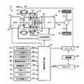 図1に示すように、前記電動機MGは、前記ケース36により軸心まわりの回転可能に支持されたロータ30と、そのロータ30の外周側において前記ケース36に一体的に固定されたステータ32とを、備えており、駆動力を発生させるモータ(発動機)及び反力を発生させるジェネレータ(発電機)としての機能を有するモータジェネレータである。この電動機MGは、インバータ56を介してバッテリやコンデンサ等の蓄電装置58に接続されており、後述する電子制御装置50によりそのインバータ56を介してコイルに供給される駆動電流が調節されることにより、前記電動機MGの駆動が制御されるようになっている。換言すれば、前記インバータ56を介しての制御により前記電動機MGの出力トルクが増減させられるようになっている。