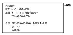 ユーザがUI314で宛先登録を指示し、宛先No.(No.はNumber)を選択すると画面601が表示される。画面601では、宛先No.01を設定することができる。ユーザがUI314を介して名称を入力する。ユーザがUI314を介して各種の入力を行うにはUI314のタッチパネルを利用するか、不図示のキーボードや音声識別入力を利用することができる。この入力される名称は、ユーザにとって相手先を区別するためにわかりやすい適切な名称を64文字以内で自由に付けることができる。ここでは、宛先の名称に”支店1”を設定する。