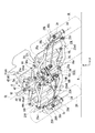図2、図4、図6を参照し、アクチュエータ41は、ハウジング42の中心軸線C7回りのトルクを発生させる電動機もしくは流体機器であり、その後部には、左上後方に突出して軸線C7回りに揺動する前揺動アーム43を有する。図中符号41aはアクチュエータ41における軸線C7を共有する駆動軸(出力部)を示し、この駆動軸41aに前揺動アーム43が固定されて軸線C7回りに揺動する。前揺動アーム43と、クッション支持アーム44の後揺動アーム46とは、アクチュエータ41の軸方向で間隔を空けて配置される。前揺動アーム43と後揺動アーム46との連結部40には、前後揺動アーム43,46を一体的に揺動可能とする連結装置47(荷重検出部)が設けられる。連結装置47は、前後揺動アーム43,46の間を伝わる荷重を検出する荷重検出部としても機能する。