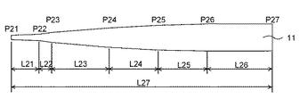 図3に示す形状のマンドレル11(鉄製)を用意した。このマンドレル11は、全体の長さL27にあって、その細径端P21から長さL21の位置(切換点)P22まで、その外径が直線的に漸増し、同様にP22から長さL22の位置P23まで、P23から長さL23の位置P24まで、P24から長さL24の位置P25まで、P25から長さL25の位置P26まで、その外径が直線的に漸増している。そして、切換点P26から長さL26の大径端P27まで、その外径は一定である鉄製の円筒体からなる。本実施例による前記マンドレル11の各部位における具体的な外径、長さ、テーパー度は以下のとおりである。