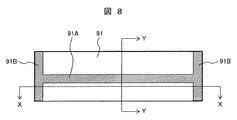 図8は混合鮮度保持剤収納体90を上面からみた図であり、破線で示す領域が第2の収納体91の接着部分であると共に放出制御部91A、91Bを形成するものである。第2の収納体91は、アルミニウムフィルム92が貼着された紙フィルム93よりなる矩形の複合シートの両端面の一部が重なるように折り畳み、この部分を接着して放出制御部91Aとするものである。