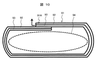 図7に混合鮮度保持剤収納体90を長手方向に沿って平行に断面した横断面を示している。第2の収納体91は気体を透過しない気体非透過性フィルムであるアルミニウムフィルム92の内側に、気体透過性フィルムである紙フィルム93を貼着して形成されている。紙フィルム93はパルプ紙から作られており、パルプ紙には繊維の間に細かい通気孔が形成されている。紙フィルム93の内側には第1の収納体94が収納されており、この第1の収納体94も気体透過性部材であるパルプ紙から形成されている。第1の収納体94の内部には揮発性鮮度保持剤95と脂溶性抗酸化剤96が混合した混合鮮度保持剤が封入されている。