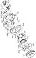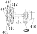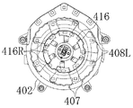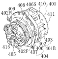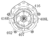 図37ないし図41に示すように、駆動軸414の後端部には第3被動ギア427が固定されており、該第3被動ギア427は前記第2モータ410の駆動軸に固定された第3駆動ギア428に咬合していて、これにより、前後方向に延びる駆動軸414を介し第2モータ410の回転が伝達されて回転体405が回転駆動されるようになっている。即ち、上記駆動軸414、第3被動ギア427および第3駆動ギア428により第2動力伝達機構が構成されている。