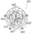 (4)この後、回転盤406の回転を停止し、第1モータ417を逆回転させ、回転盤406を反対方向(時計回り方向)に回転させる方向に動力を伝達させると、図44(b)に矢印A3で示すように、6個の可動片407が一斉に縮小して、元の中心寄りの位置に戻り、回転体405の背後に殆ど隠れた状態に復帰する。この場合にも、回転盤406は、オイルダンパで制動されることにより、所定レベルを超えるトルクがかからないうちは回転が規制されるので、第1動力伝達機構から動力が伝達されると、回転盤406にまだ大きなトルクがかかっておらず回転が開始されないうちに、先に可動片407のみが駆動されて縮小する方向にスライド動作する。